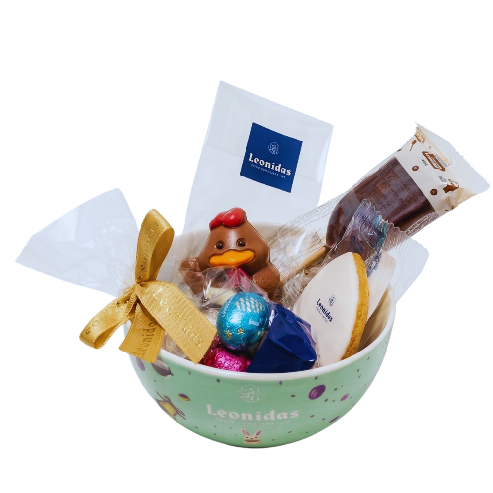 Un cadou de Paște plin de surprize dulci, aranjat cu grijă într-un bol ceramic Leonidas decorat cu motive de primăvară. Perfect pentru a aduce bucurie celor dragi la masa de Paște.