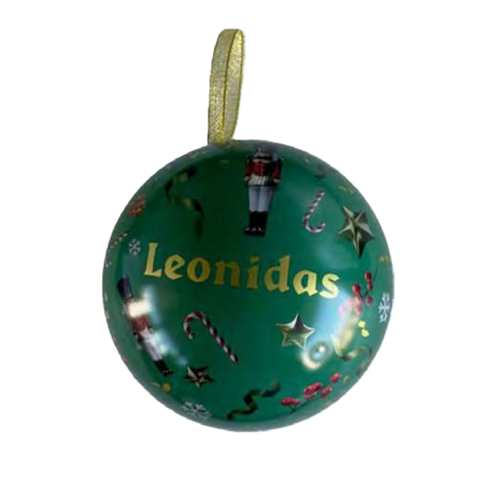Globuleț metalic de Crăciun cu 150g de praline belgiene Leonidas. Un ornament elegant și delicios, perfect pentru a fi agățat în brad sau oferit cadou.