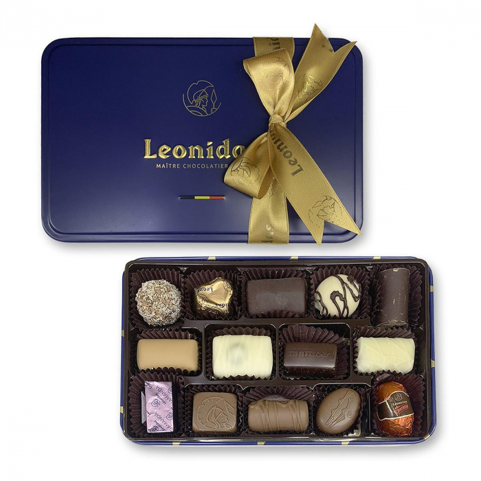 Fiecare cutie metalică este umplută cu praline artizanale Leonidas – ciocolată belgiană neagră, cu lapte sau albă, cu umpluturi savuroase precum ganache de cafea, cremă de fistic, caramel sărat sau lichioruri fine. Calitate desăvârșită, fără ulei de palmier, 100% prospețime.
